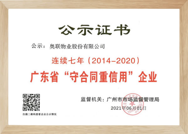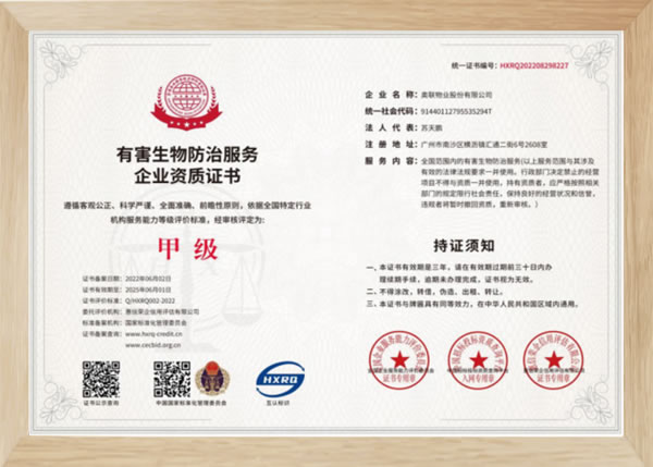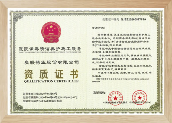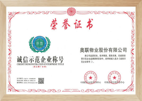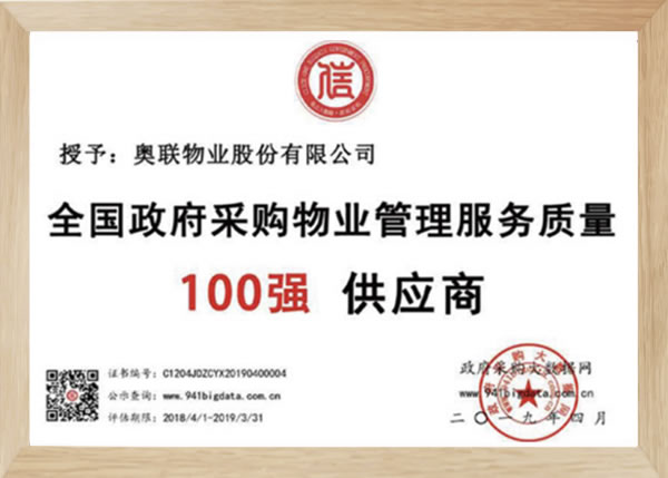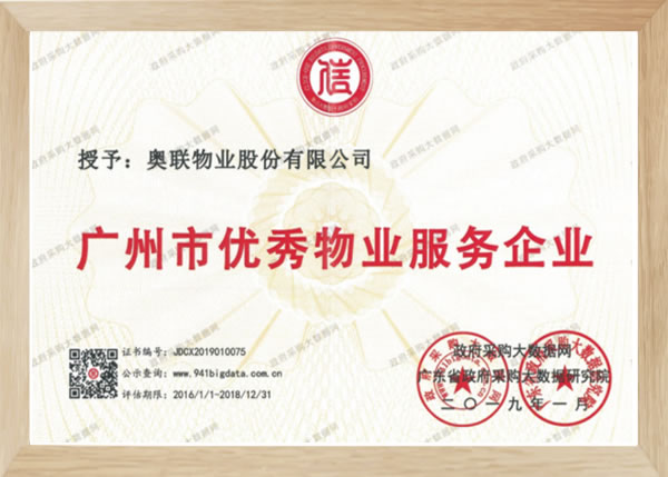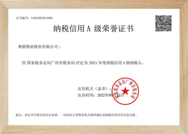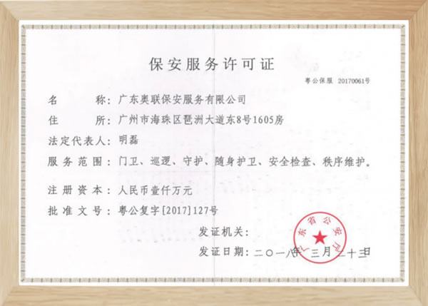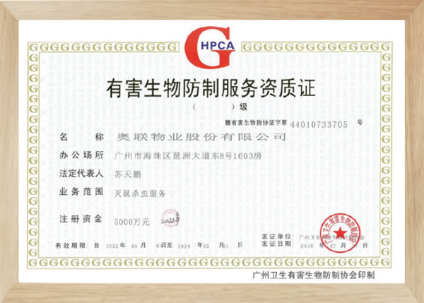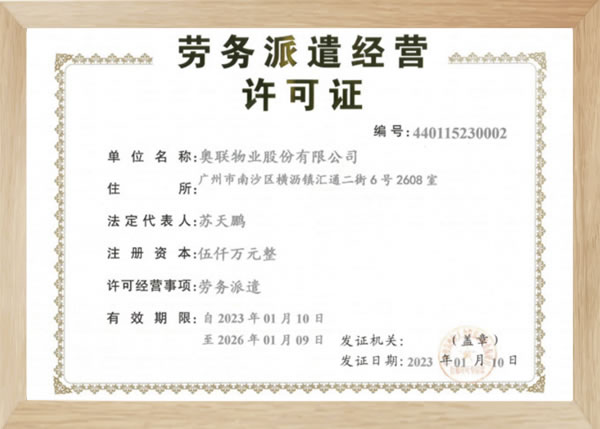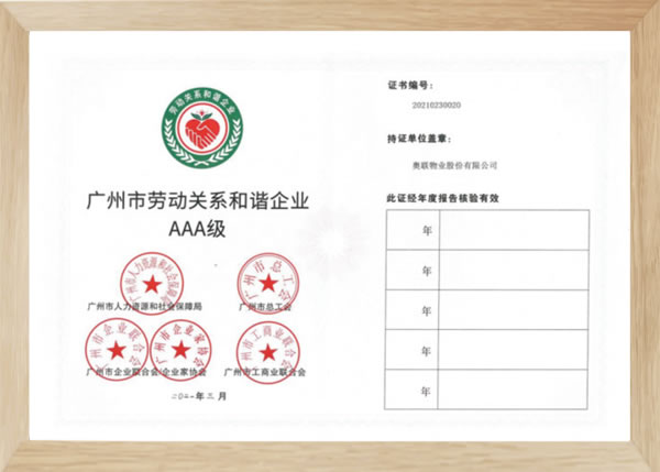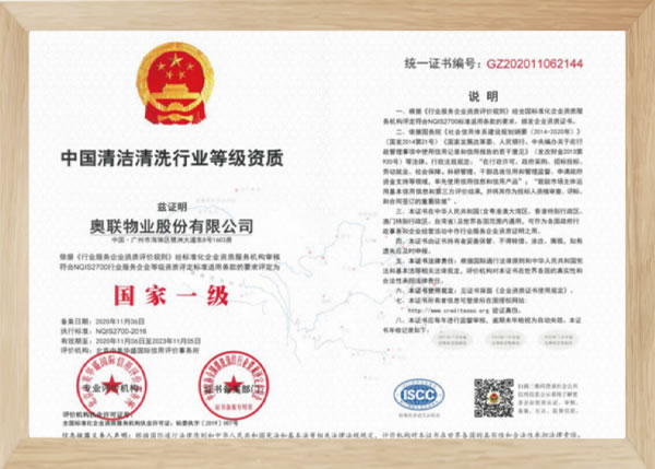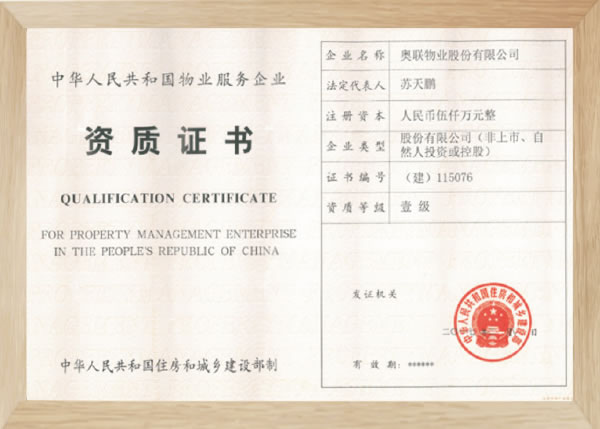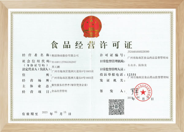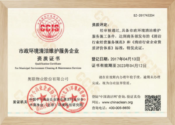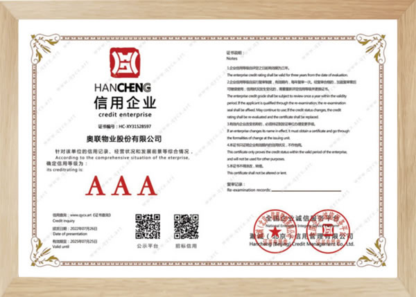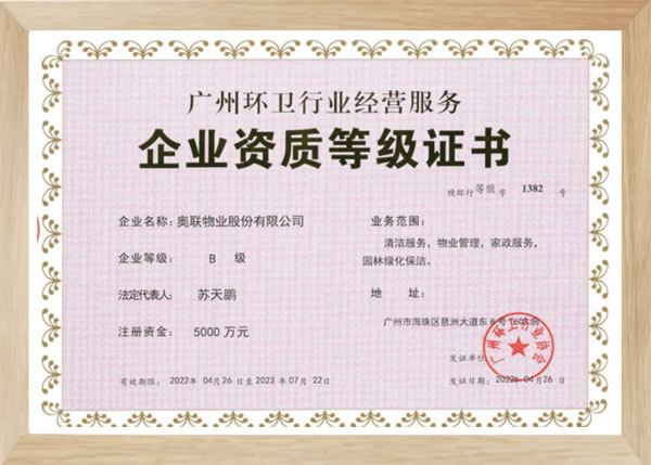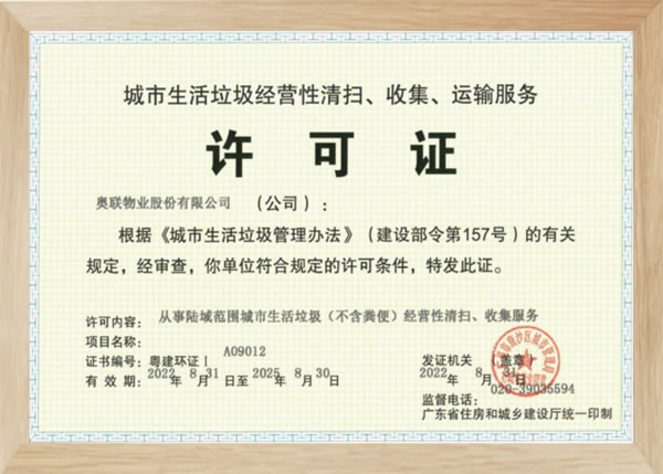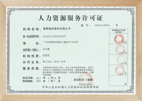 奥联服务获得由政府及行业主管部门颁发的物业服务、园林绿化、环卫服务、安保服务、人力资源、食品经营、道路运输及智能科技等20多项企业资质。