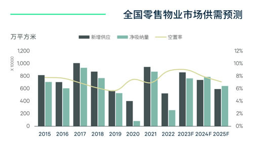 2023年新增供应将突破800万平方米。由于2022年约有30%的零售物业项目受疫情影响而延期开业,CBRE预计2023年全国主要城市优质零售物业新增供应将突破800万平方米,之后两年逐步回落,但总体上未来三年供应仍显充沛。从需求端来看,防疫措施调整和国内消费复苏将加速零售品牌的拓店步伐。CBRE《2023年亚太区零售商调查》结果显示,71%的中国内地受访者将在2023年新设门店,领先亚太区市场。CBRE预计,国内优质购物中心空置率将在2023年触顶回落,2025年有望回落至7%左右的低位。