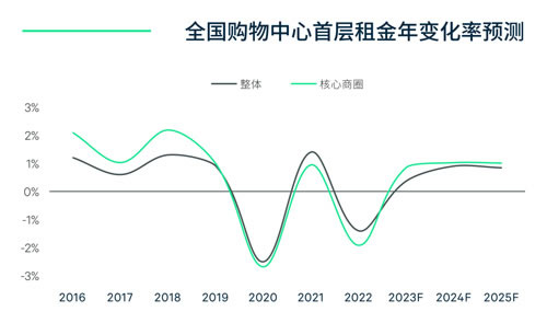 基于可租面积的稀缺性和品牌强劲的扩店意愿,全国18个主要城市核心商圈的租金有望在2023年实现0.9%的同比增长,一线城市核心商圈将录得更快的增速1.7%。整体市场来看,随着空置率在2023年触顶回落,购物中心平均租金将于2024年企稳回升,录得1%左右的小幅增长,并在2025年延续该租金走势。